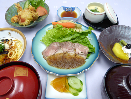 오이타 현의 향토 요리도 메뉴에 포함됩니다. 토리 텐, 카라 게, 단고 지루 등