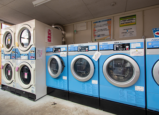 9대형 세탁설비로 합숙지 선택의 고민을 해결세탁기 10대, 건조기 8대 (업무용 대형 기재), 행거 대여도 OK! 세탁 코너의 세탁기, 건조기는 모두 무료로 이용 가능합니다. 지붕이 있는 세탁물을 말릴 장소도 있습니다.